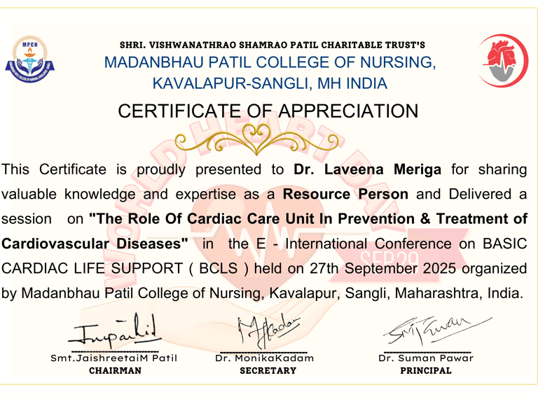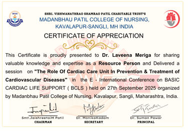 Dr. Meriga was awarded the following certificate in recognition of sharing valuable knowledge and expertise on “The Role of the Cardiac Care Unit in the Prevention and Treatment of Cardiovascular Disease” during the International Conference on Basic Life Support, held on September 27, 2025, and organized by Madanbhau Patil College of Nursing, Kavalapur, Sangli, Maharashtra, India.