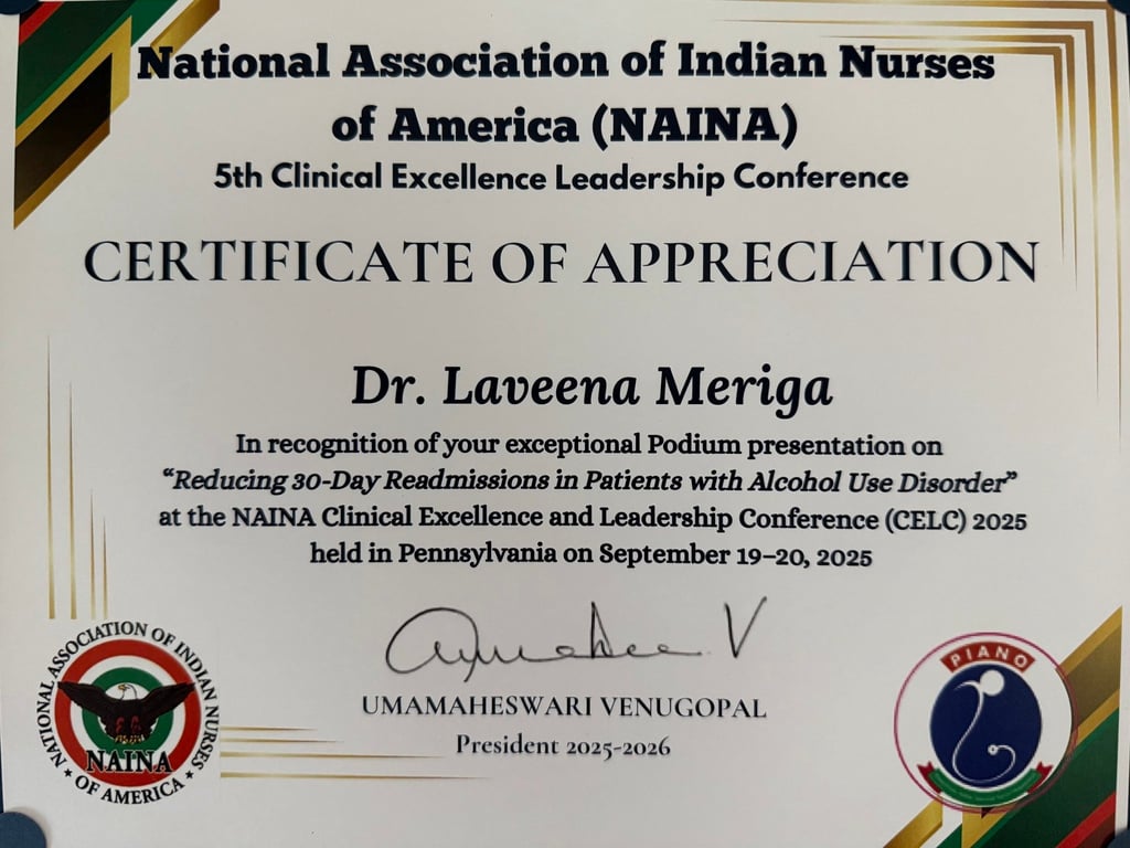 Dr. Meriga was given the opportunity to showcase and present her DNP Quality Improvement Project at the CELC NAINA Conference in September 2025.