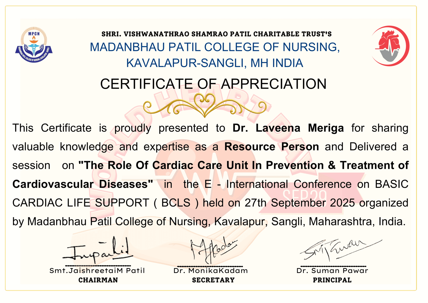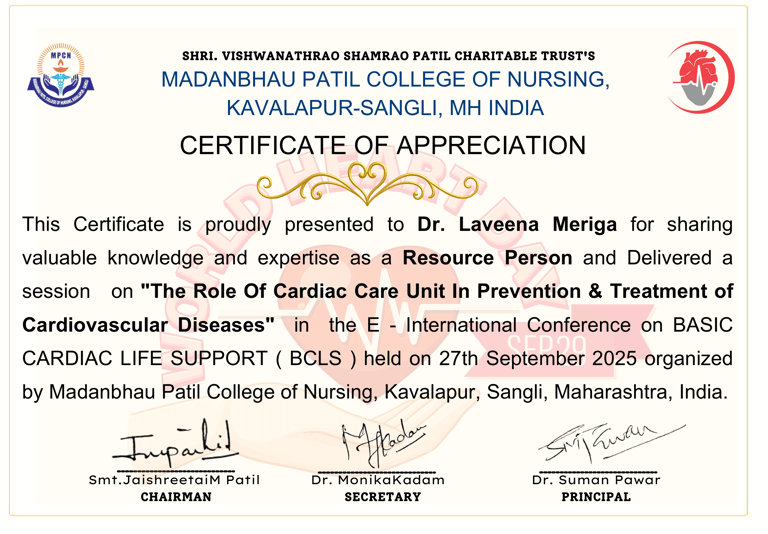 Dr. Meriga was awarded the following certificate in recognition of sharing valuable knowledge and expertise on “The Role of the Cardiac Care Unit in the Prevention and Treatment of Cardiovascular Disease” during the International Conference on Basic Life Support, held on September 27, 2025, and organized by Madanbhau Patil College of Nursing, Kavalapur, Sangli, Maharashtra, India.